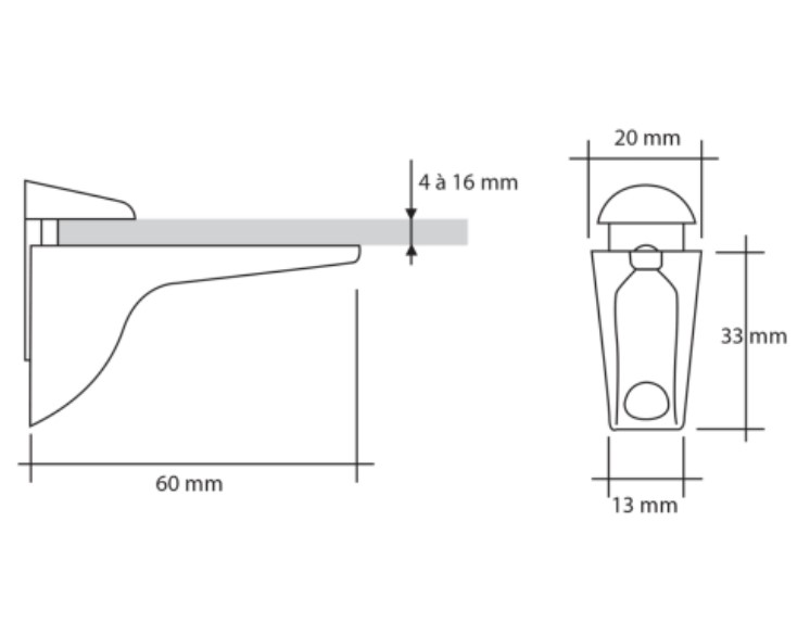 Nous vous proposons un lot de deux Supports Tablette d’une longueur de 60mm permettant de fixer des tablettes en verre ou autres de 4 à 16mm d’épaisseur, et de profondeur maxi 15cm.