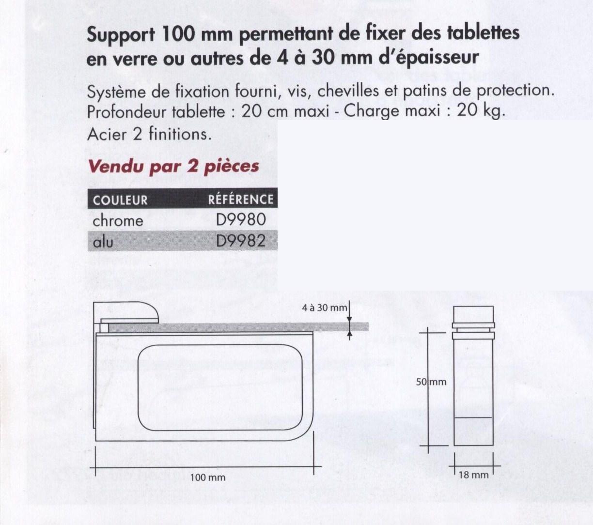 Sa longueur de 100mm permet de fixer des tablettes en verre ou autres de 4 à 30mm d’épaisseur, et de profondeur maxi 30cm.