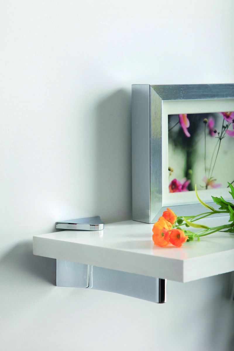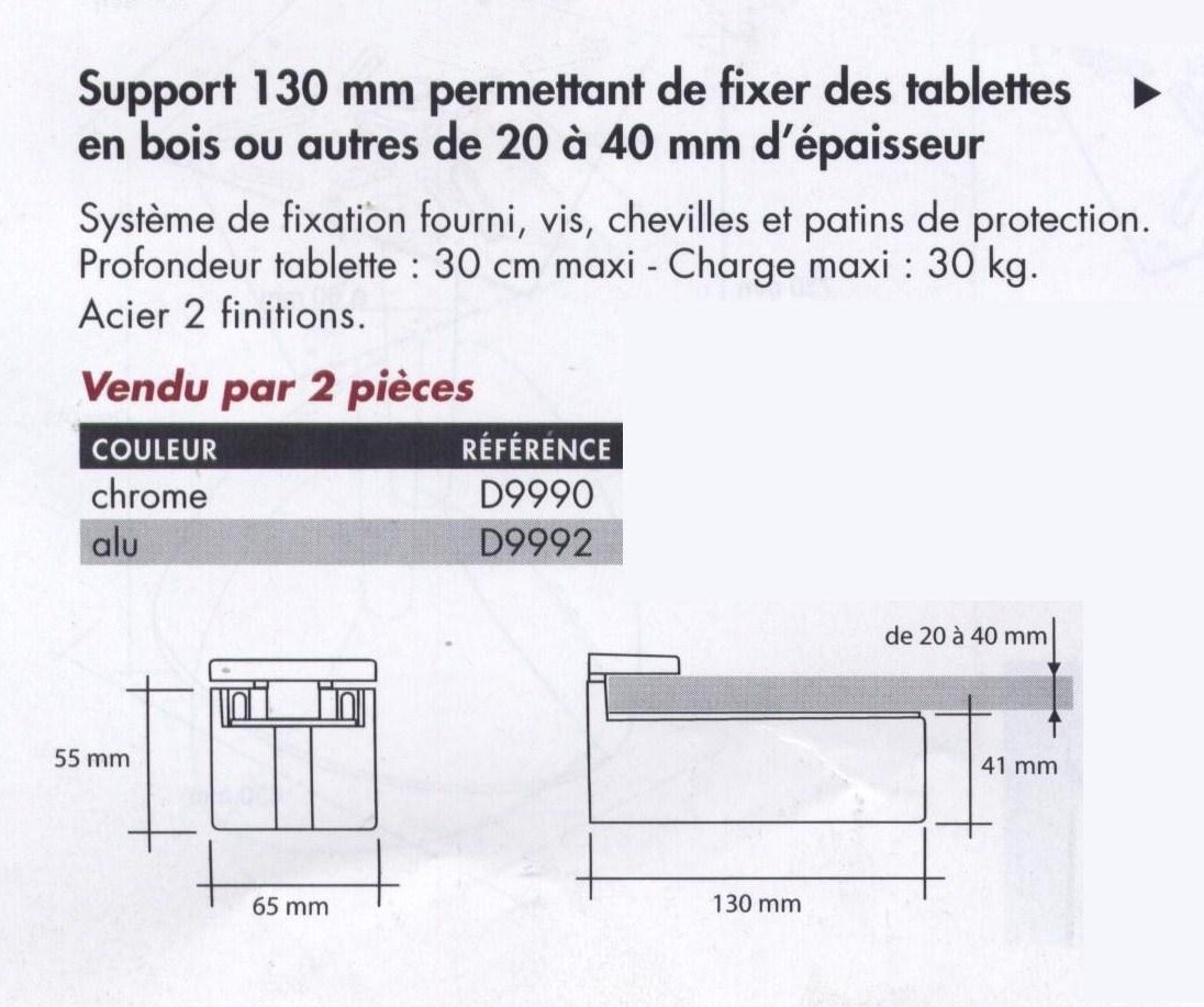Support 130mm permettant de fixer des tablettes en verre ou autres de 20 à 40mm d’épaisseur, et de profondeur maxi 30cm.
