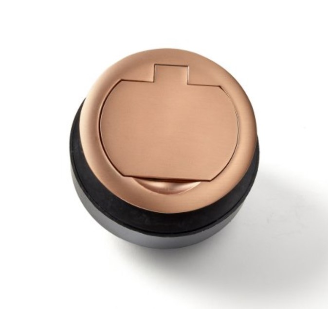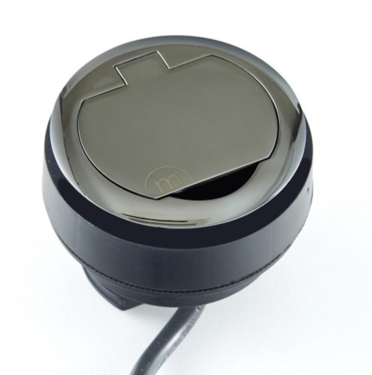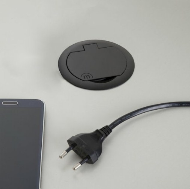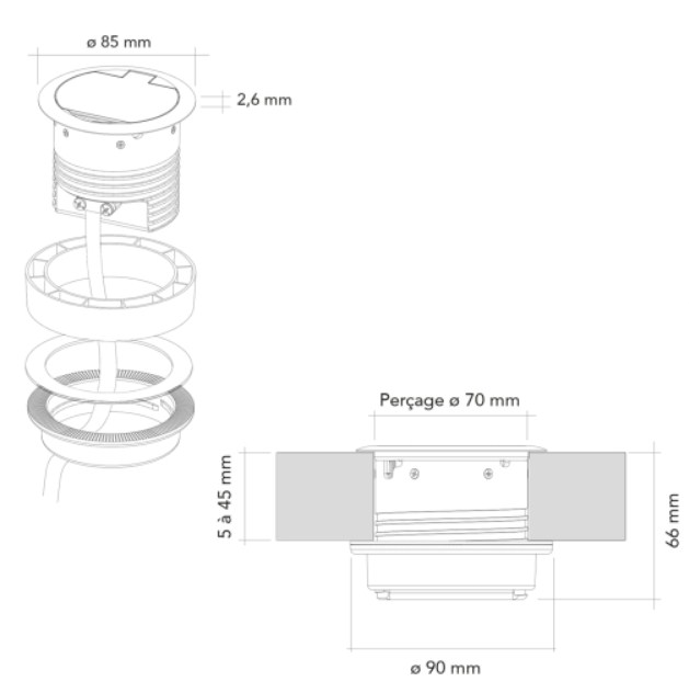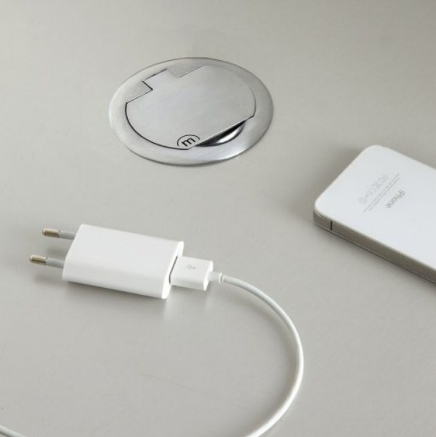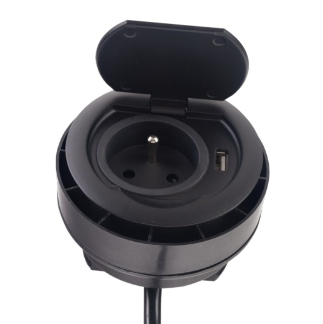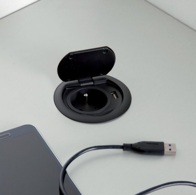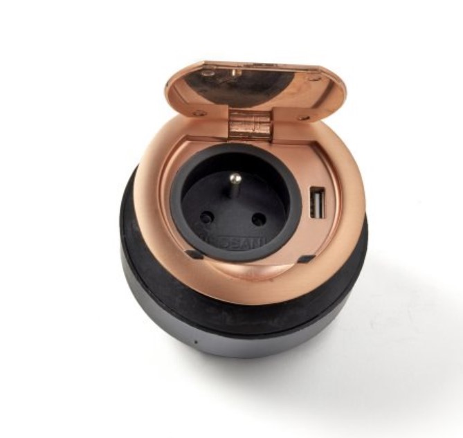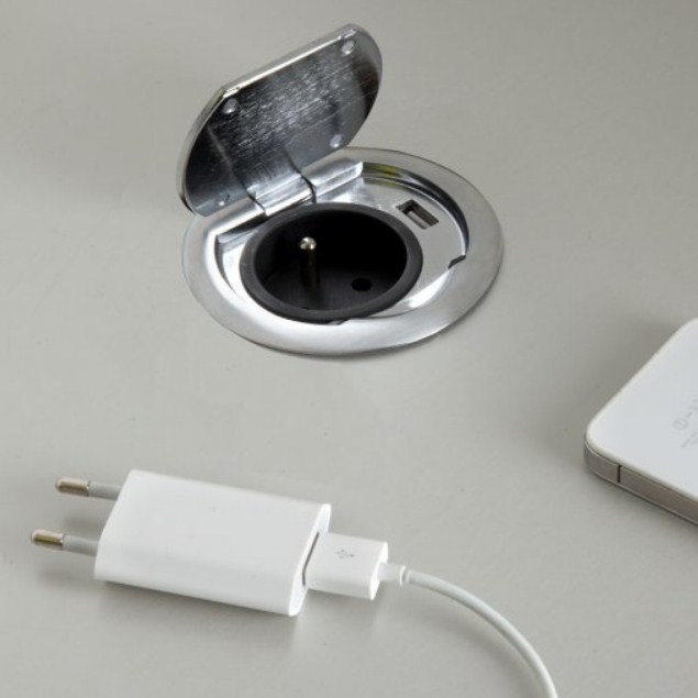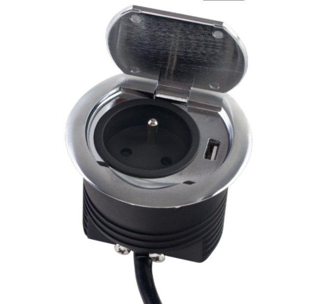 Bloc 1 prise affleurant + USB-A « RING » a encastrer dans le plan de travail (de 5 à 45mm d’épaisseur) fixation par vissage.