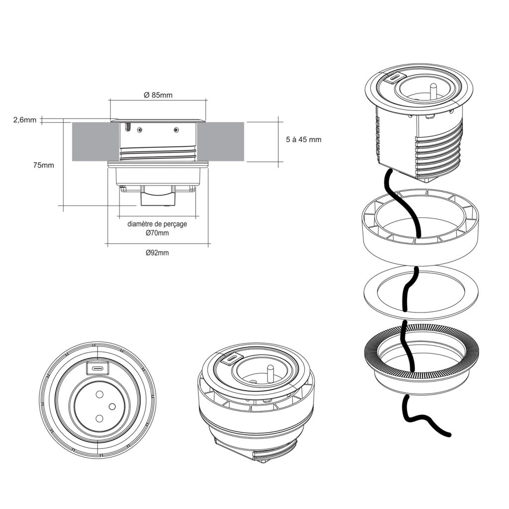 Le bloc 1 prise + USB-C DOT ( 18W charge rapide) est conçu pour s’encastrer dans un panneau de 5 à 45mm d’épaisseur en position horizontale ou verticale avec une fixation simple par vissage de l’écrou manuellement.