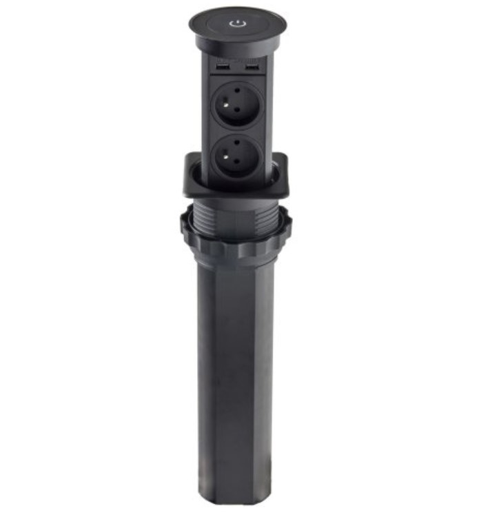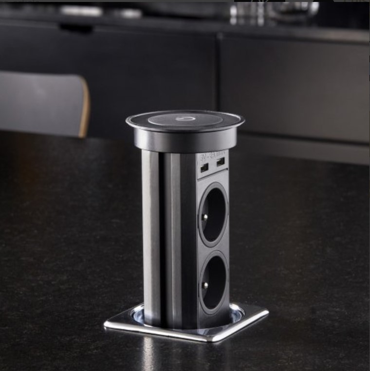 Le bloc prise Escamotable autoMATIK est équipé d’un moteur qui assure la montée et descente du bloc prise d’un simple éffleurement, et en toute sécurité puisqu’il est équipée d’un système anti pincement.
