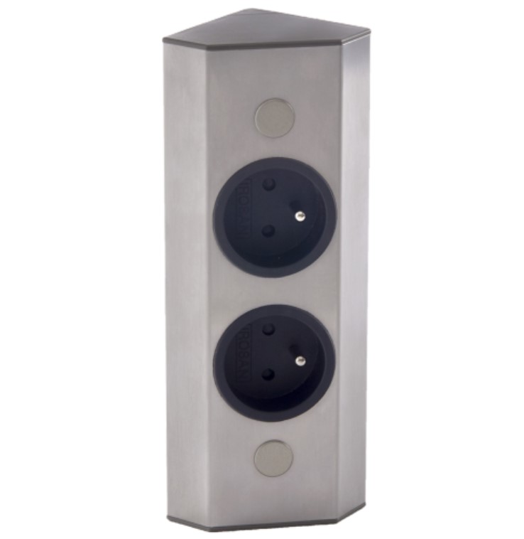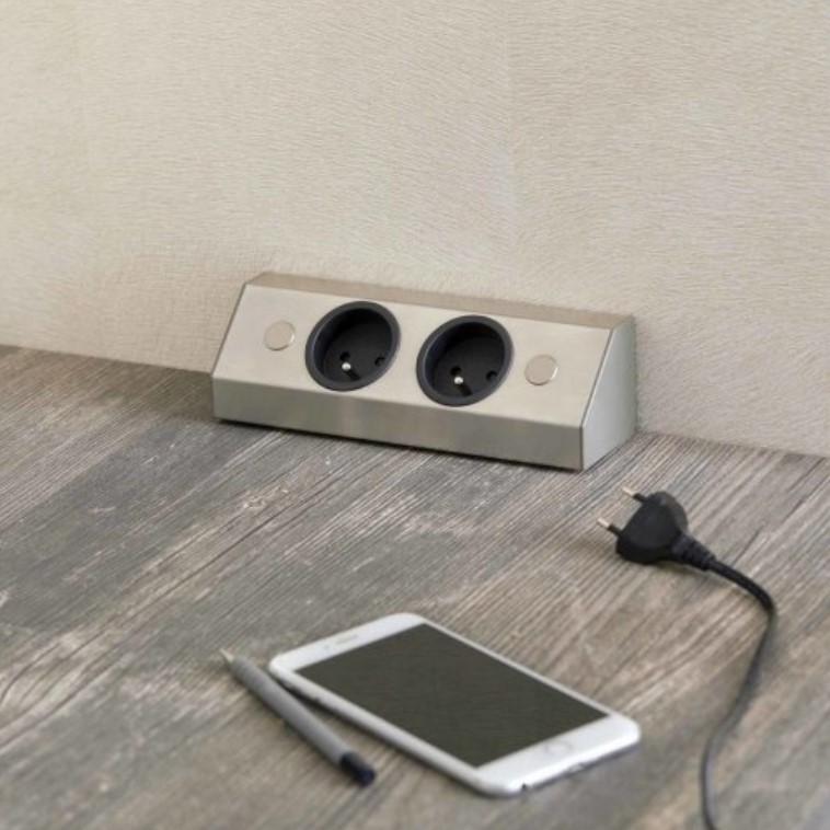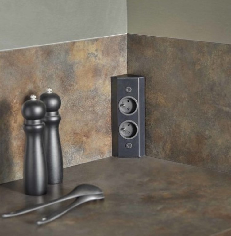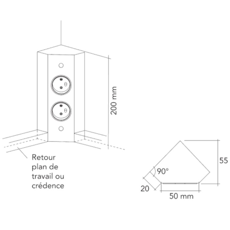 Le bloc 2 prises d’angle avec « retour » est prévu pour s’installer verticalement ou horizontalement dans un angle ou sur un plan de travail mais également sous un meuble haut.