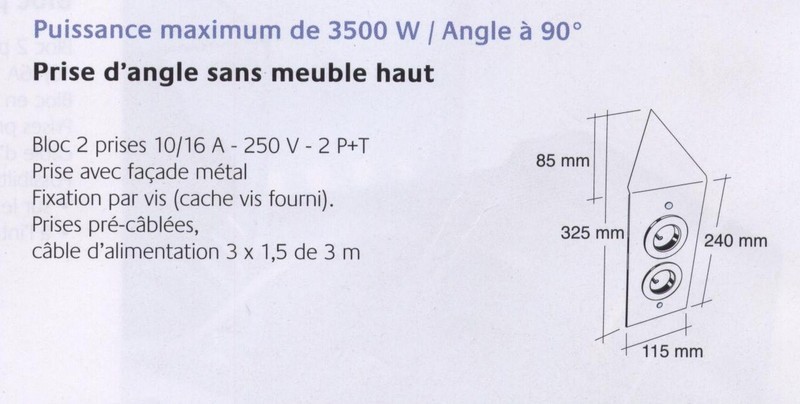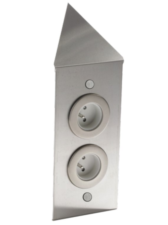 Ce Bloc 2 prises d’angle avec façade en métal finition inox fait une hauteur totale de 32,5cm. Les Prises sont pré-cablée alimentation 3 x 1,5mm² de 3 mètres. Fixation du bloc par vis ( cache vis fournis ) puissance maximum 3500 W (16A)