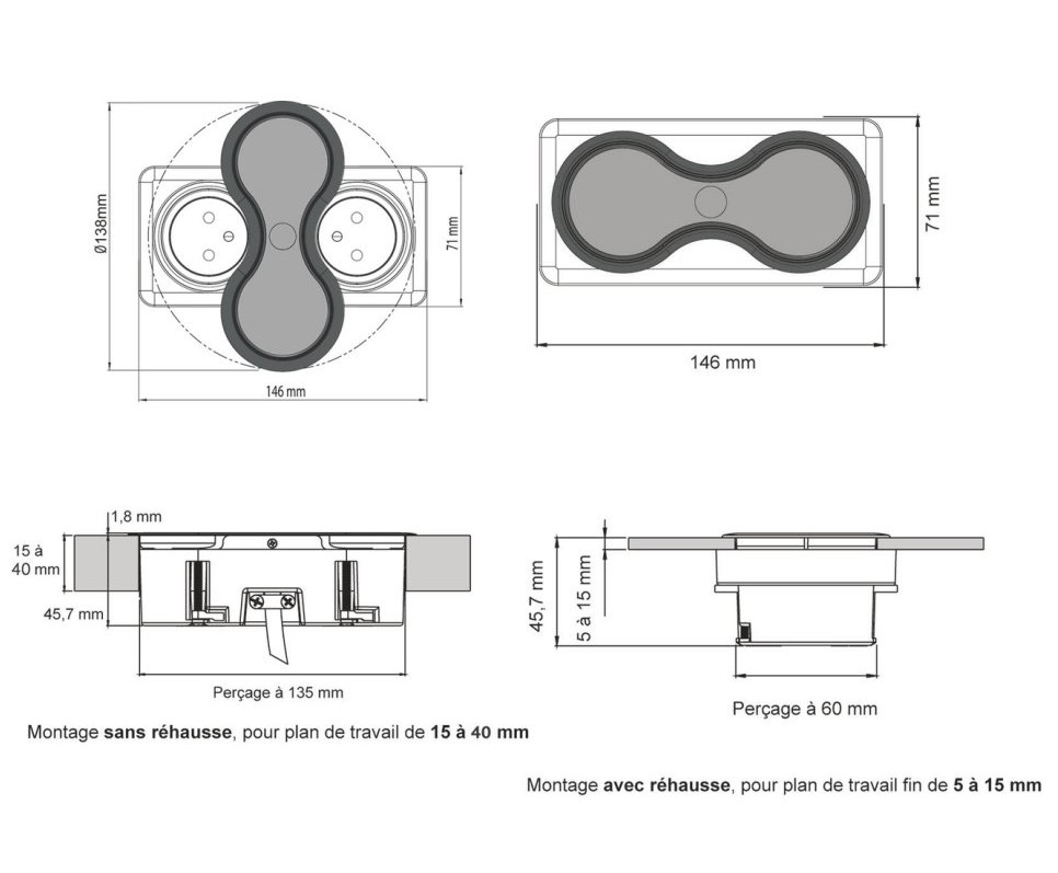 Il est prévue pour s encastrer dans un plan de travail ou un panneau d’épaisseur 5 à 40mm (réhausse incluse pour 5 à 15mm). Fixation par vissage.