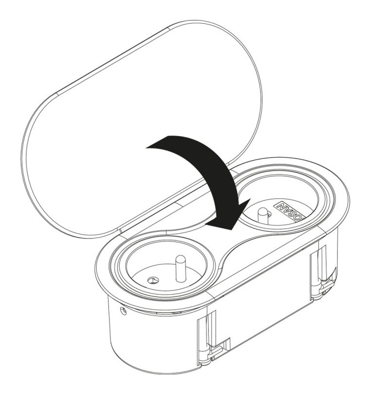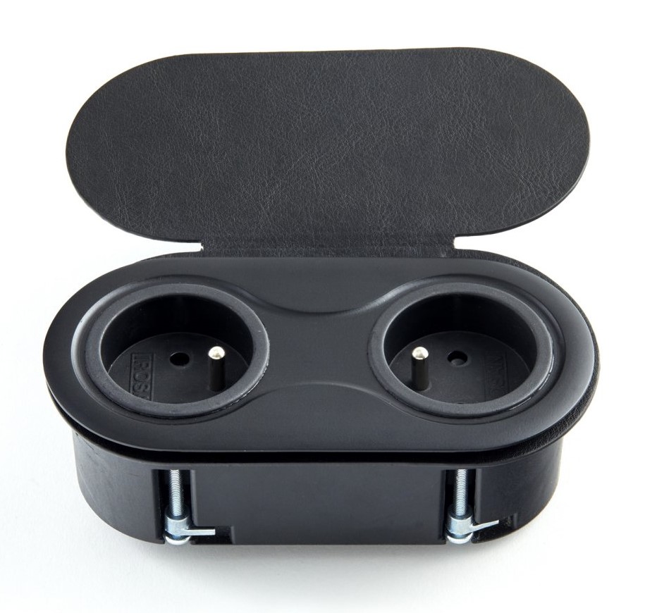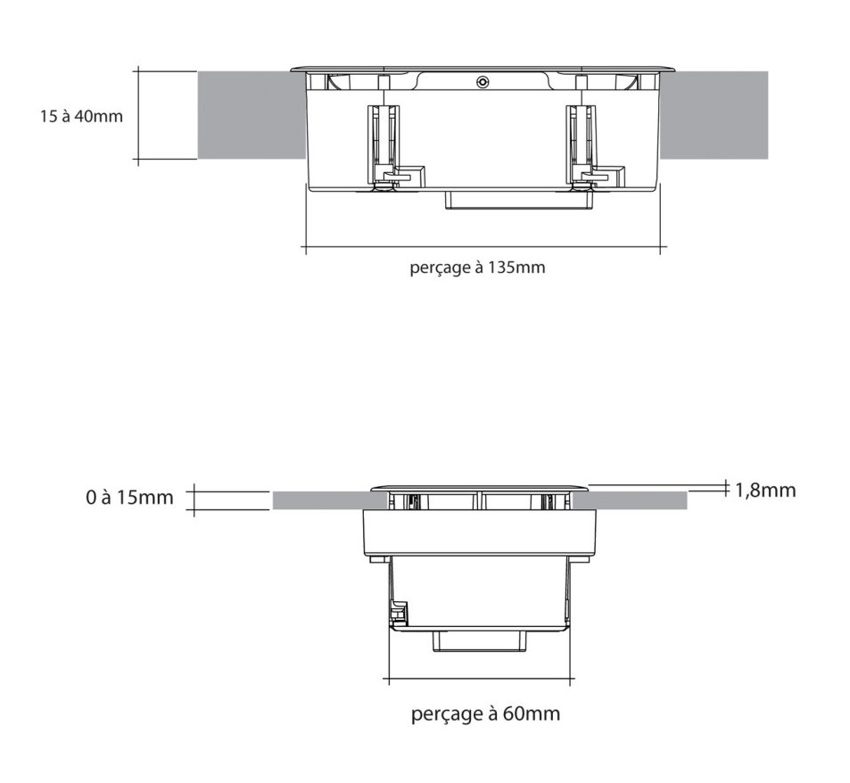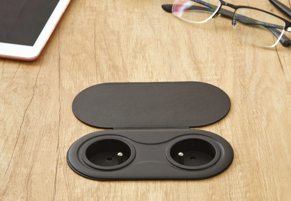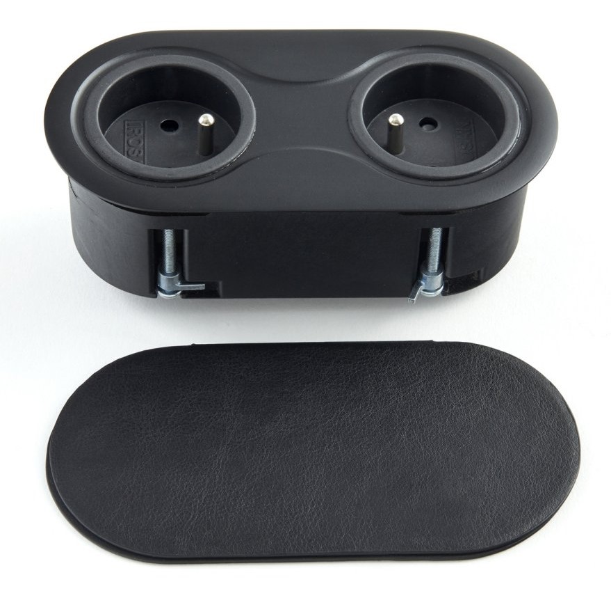 Le bloc 2 prises affleurant INFINI est conçu pour s’encastrer dans un plan de travail ou un panneau de 5 à 40mm d’épaisseur avec une fixation par vissage (de 5 à 15mm avec une réhausse (incluse)).