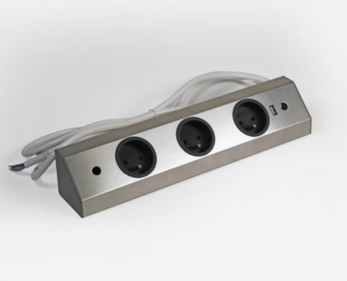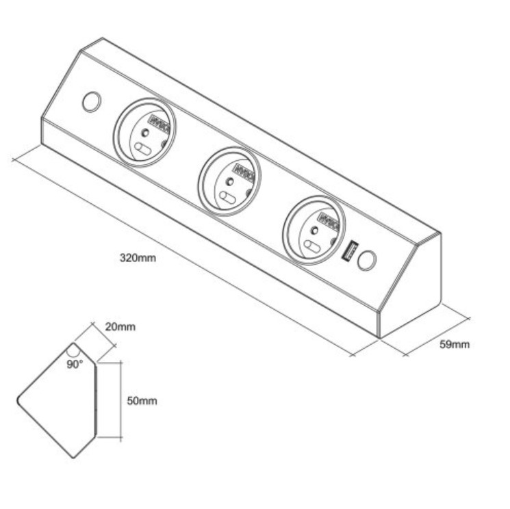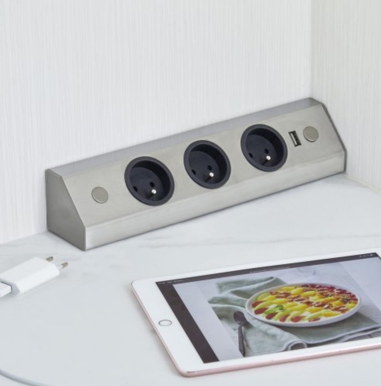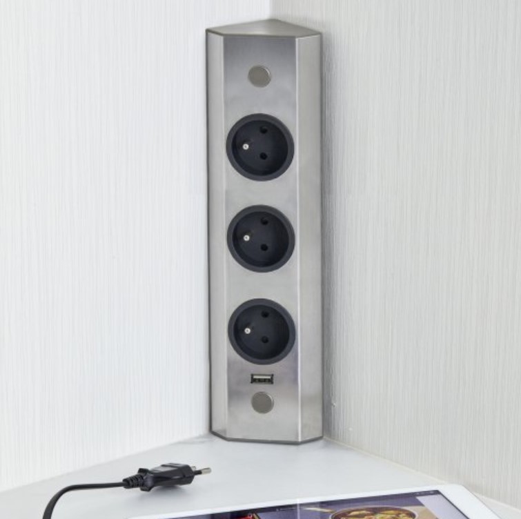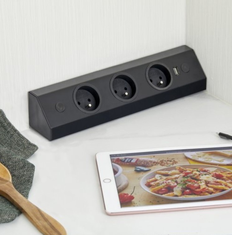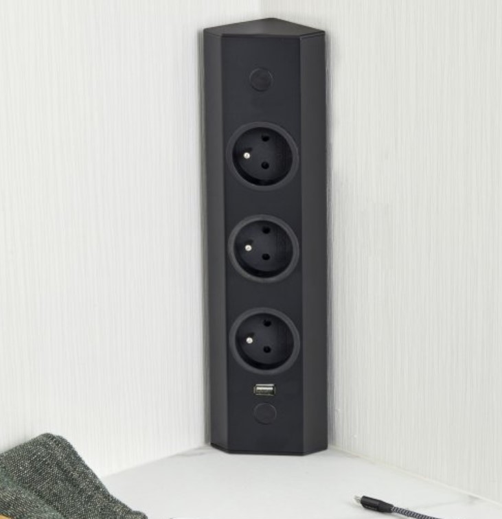 Le bloc 3 prises + USB-A d’angle avec « retour » est prévu pour s’installer verticalement ou horizontalement dans un angle ou sur un plan de travail mais également sous un meuble haut.