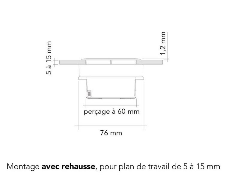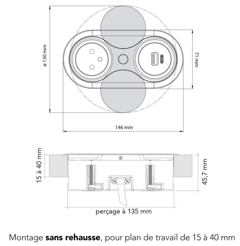 Ce bloc prise est prévu pour être encastré horizontalement ou verticalement dans un panneau d’épaisseur de 5 à 38mm (réhausse incluse pour 5 à 15mm), avec une fixation par vissage.