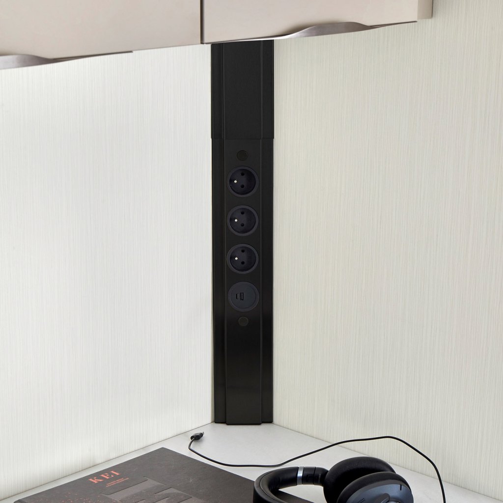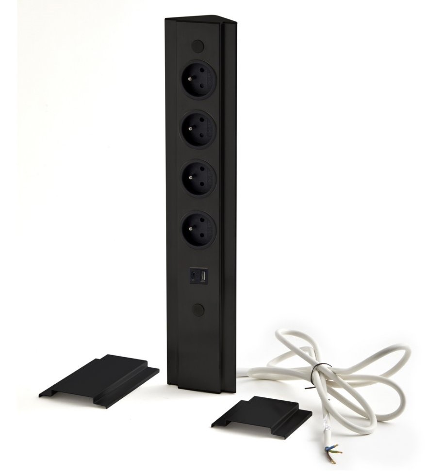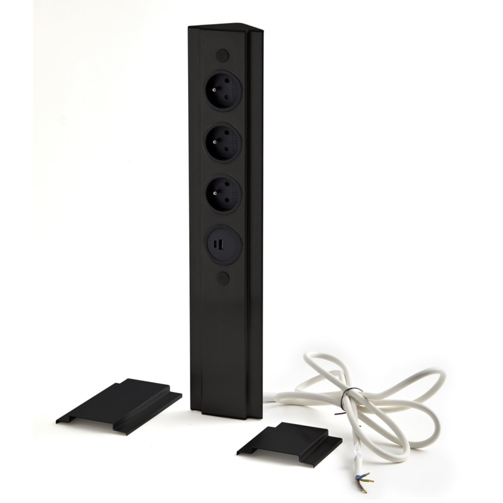 Pour votre cuisine mais également votre bureau ou coin informatique, nous vous proposons ce bloc prises en métal laqué Noir mat a fixer entre le plan de travail et le meuble haut, 2 pièces de réglage sont fournies (hauteur 90 et 150mm)qui permettent d’ajuster la hauteur du bloc prise jusqu’à 580mm de hauteur.