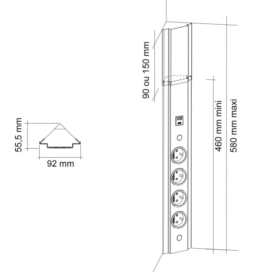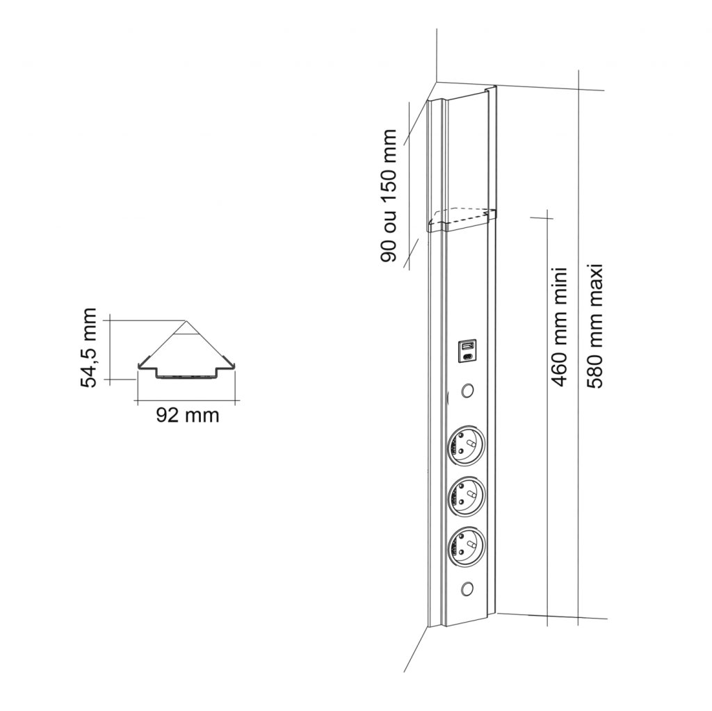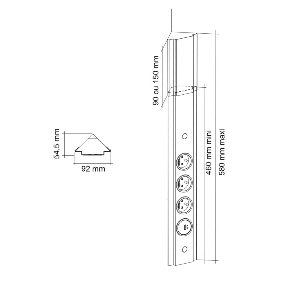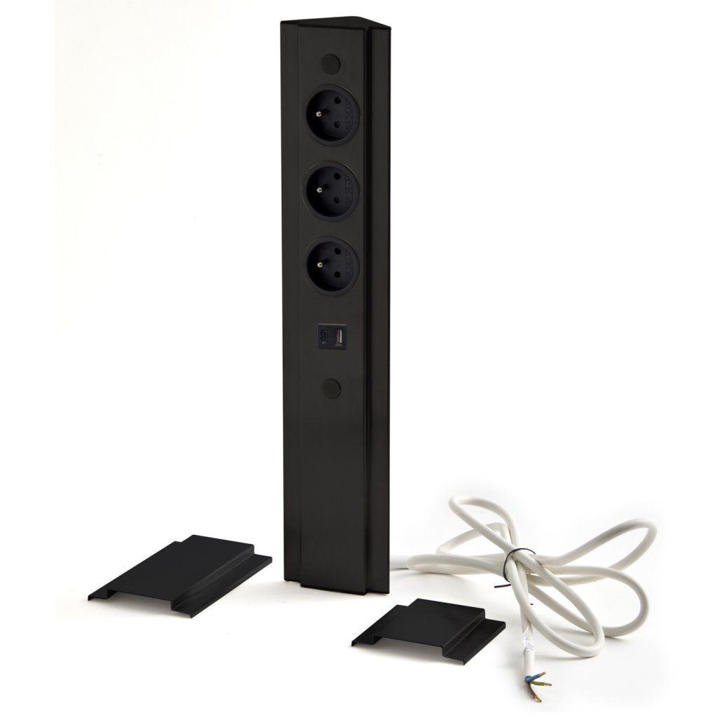 Pour votre cuisine mais également votre bureau ou coin informatique, nous vous proposons ce bloc prises en métal laqué Noir mat a fixer entre le plan de travail et le meuble haut, 2 pièces de réglage sont fournies (hauteur 90 et 150mm)qui permettent d’ajuster la hauteur du bloc prise jusqu’à 580mm de hauteur.