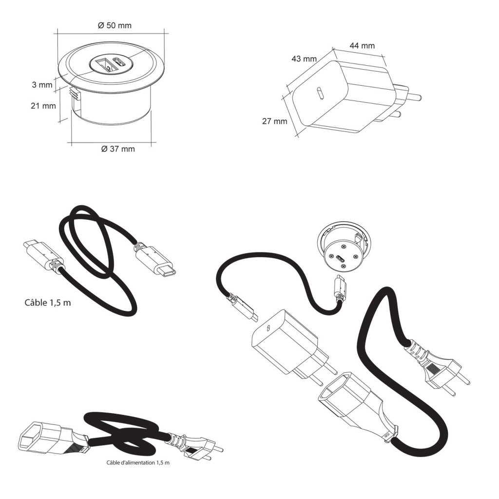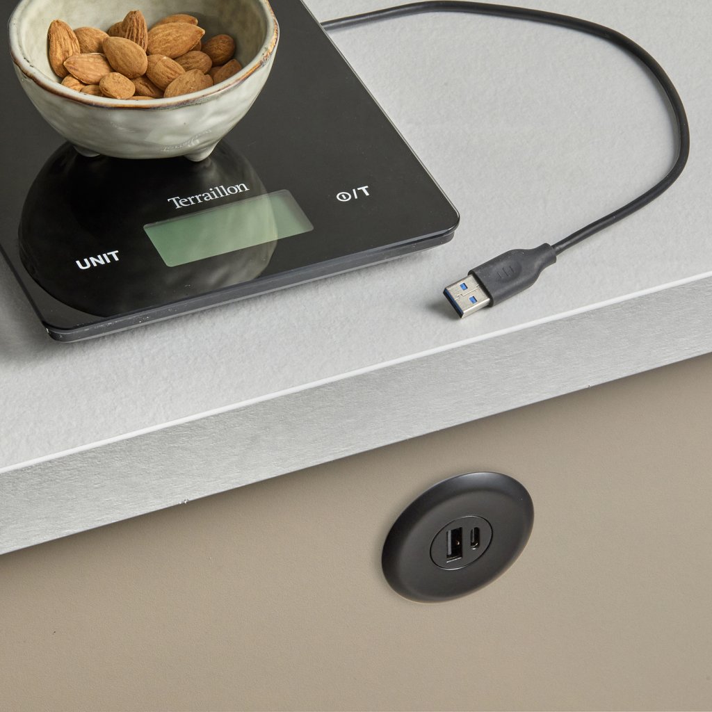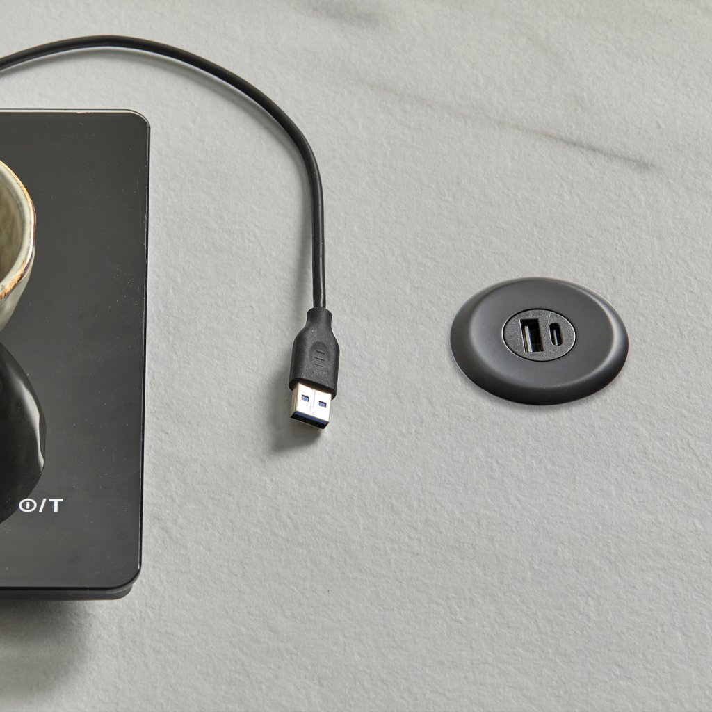 Bloc USB-A et C à fixer sur un plan de travail ou un panneau de 10mm d’épaisseur minimum.