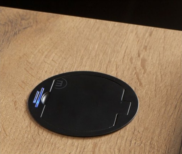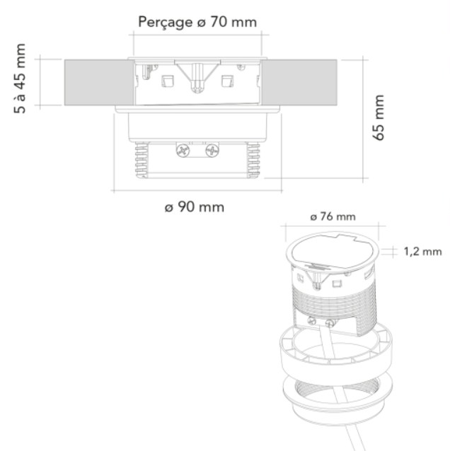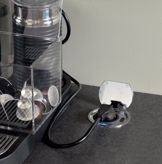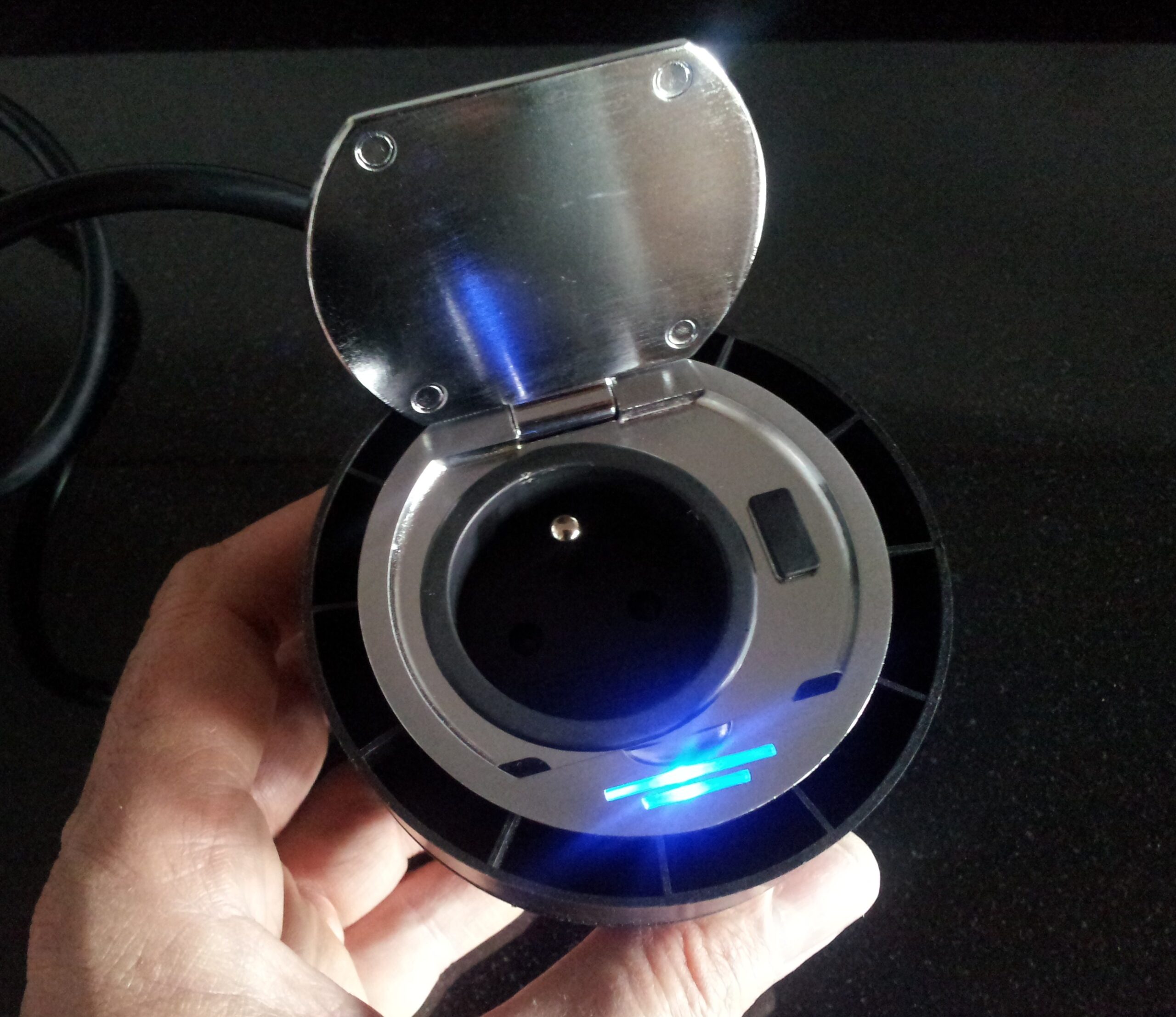 DISC le bloc une prise affleurant extra plat 1,2mm s’encastre dans un plan de travail de 5 à 45mm d’épaisseur. Il se ferme avec un clapet métal, finition inox brossé ou noir.