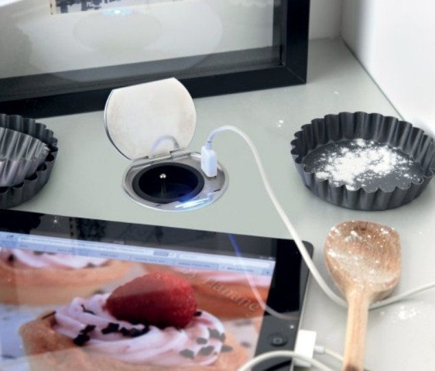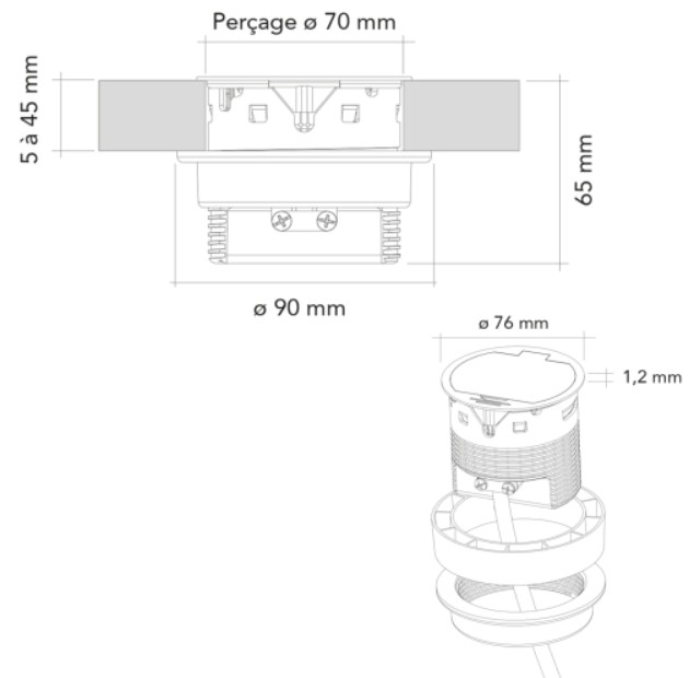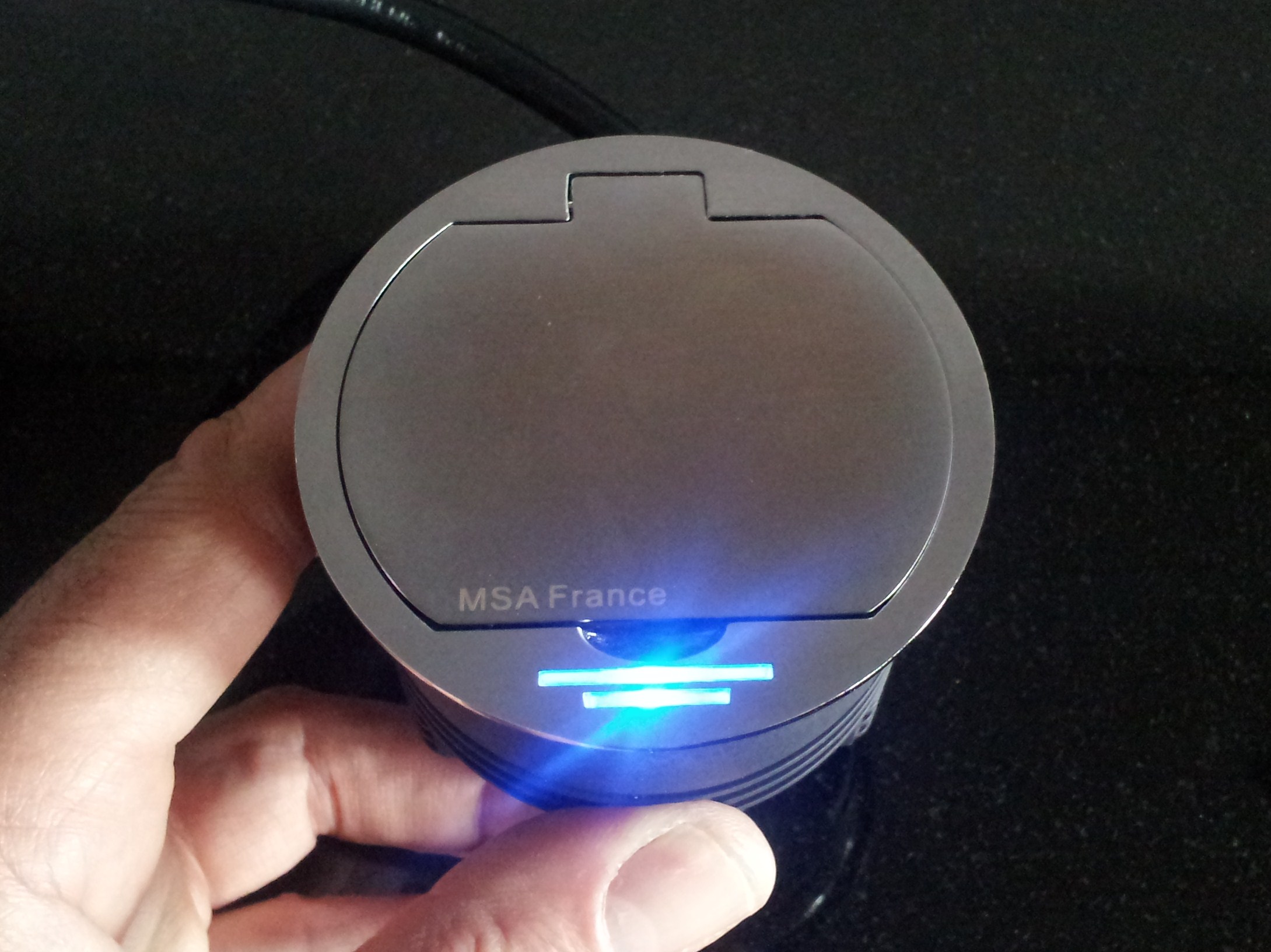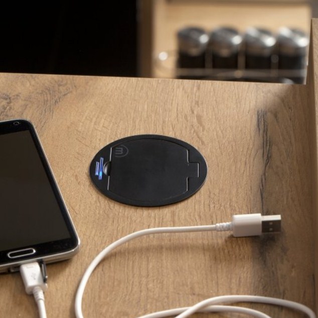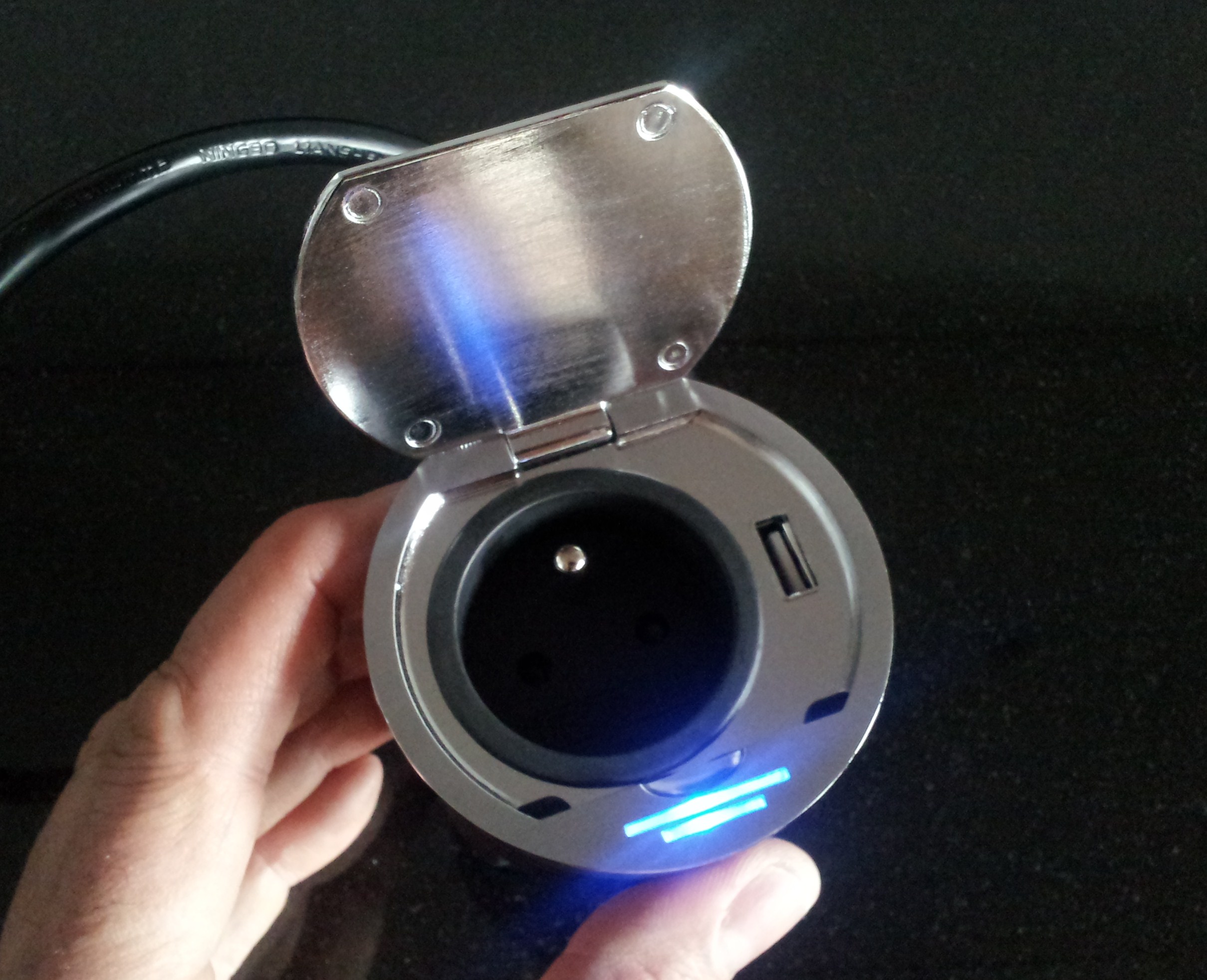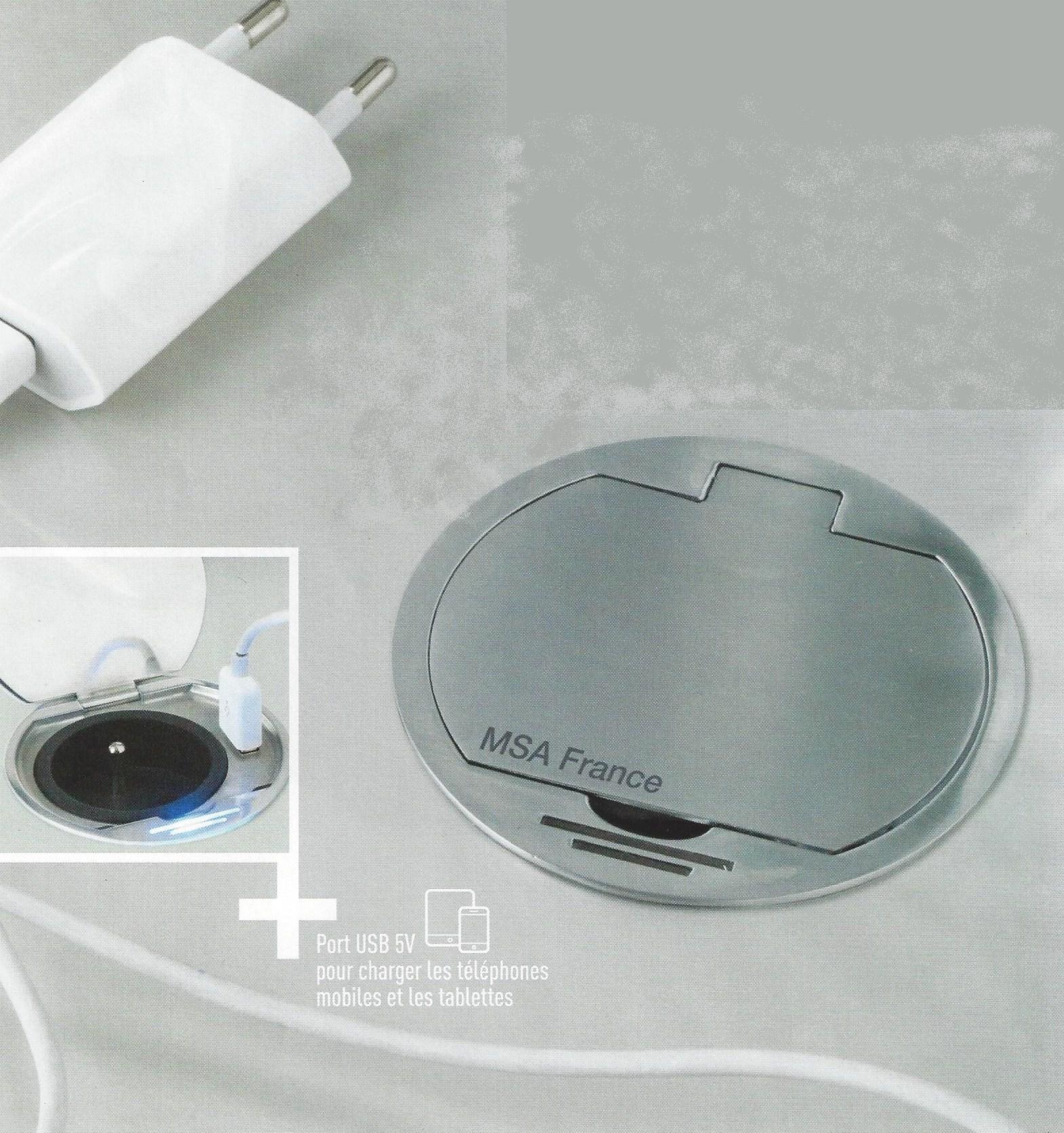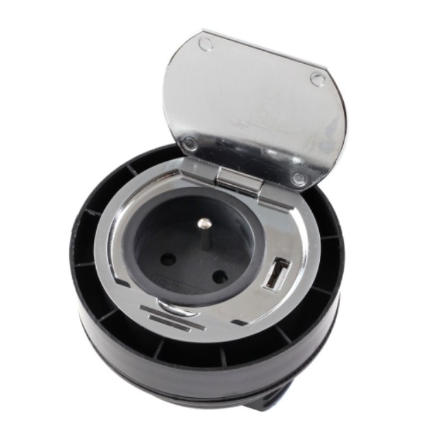 DISC le bloc une prise affleurant + USB extra plat 1,2mm s’encastre dans un plan de travail de 5 à 45mm d’épaisseur. Il se ferme avec un clapet métal, finition inox brossé ou noir. Il est équipé d’une veilleuse led bleue 0,06w permanente. Le bloc prise idéal également pour le coin informatique, bureau.