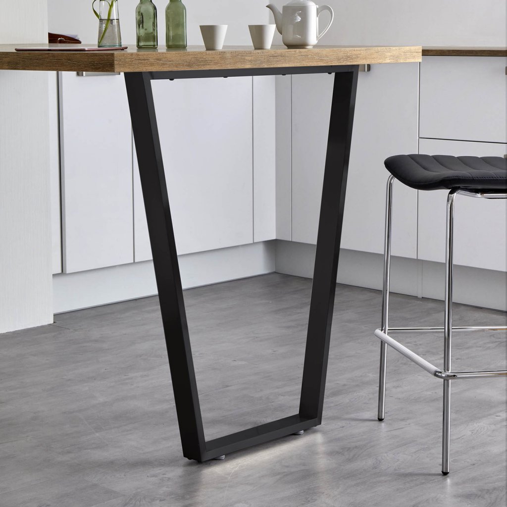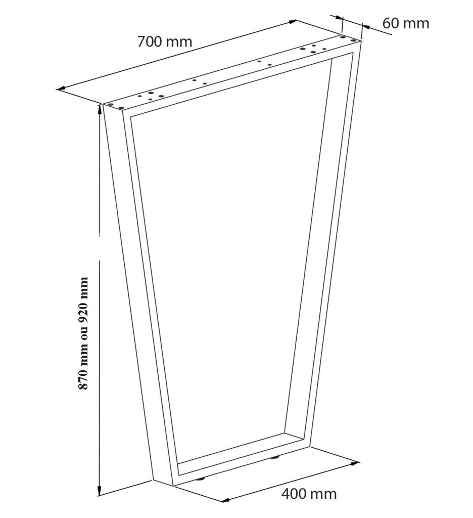 Le Pied Trapèze en acier profil rectangulaire 60 x 20mm convient pour tenir le bout d’une table hauteur plan de travail. Sa nouvelle finition Noir Mat (RAL 9005 ) finira parfaitement votre cuisine, sa largeur est de 70cm. Il existe en deux hauteurs: 870mm ou 920mm et est fourni avec des patins réglables de 5 à 10mm et visserie.