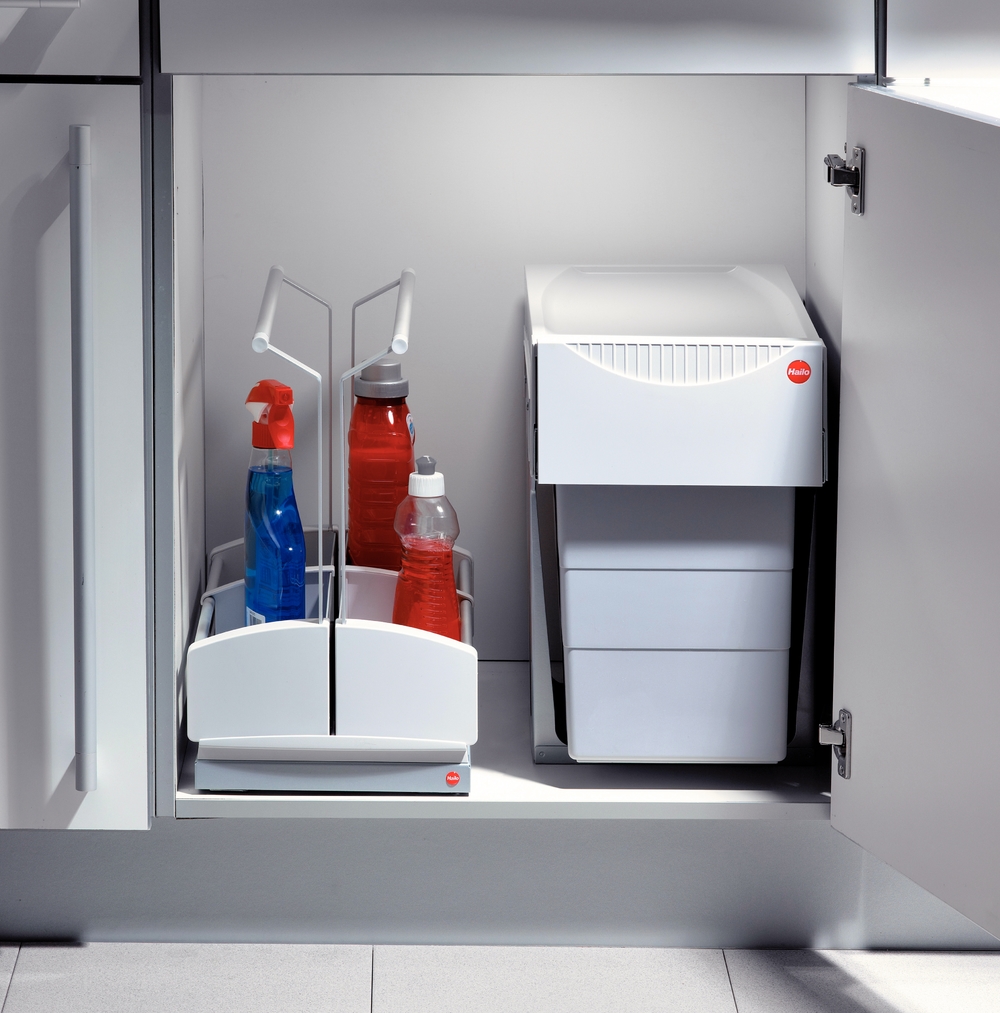 Idéal pour votre sous évier, ce porte accessoires amovible est monté sur coulisses avec sortie totale et amortisseurs de fermeture, il est composé de deux bacs amovibles avec poignée.