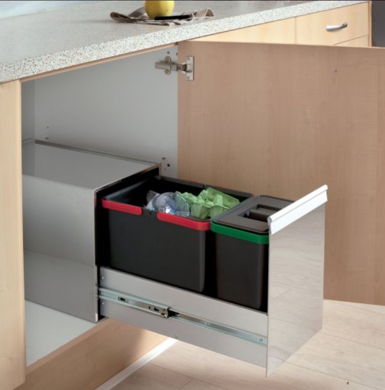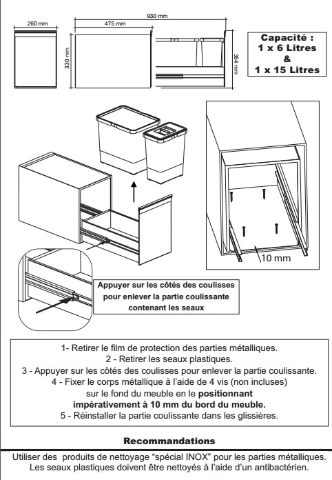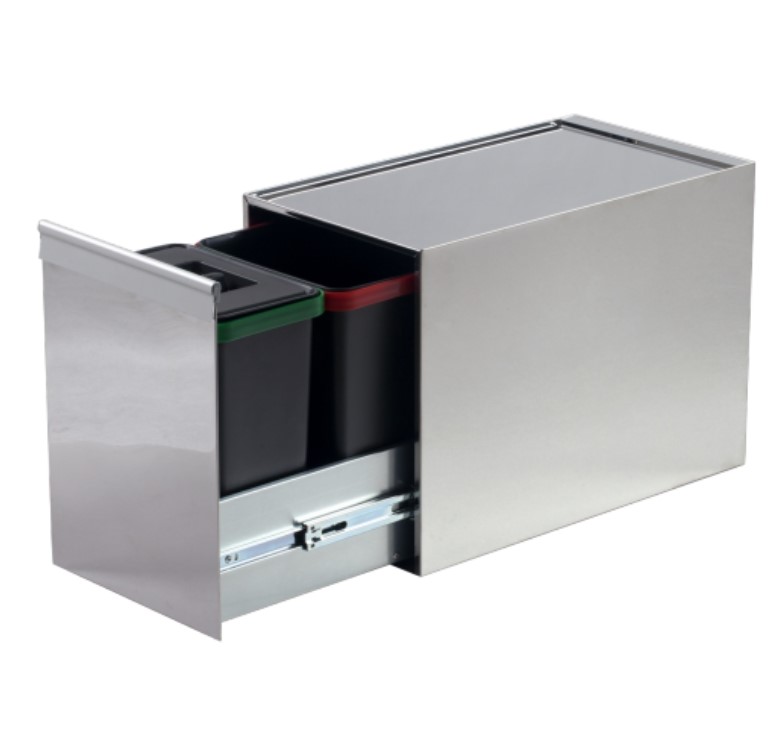 Cette poubelle 2 bacs de 15 et 6 litres ouverture manuelle est à sortie totale avec fermeture amortie.