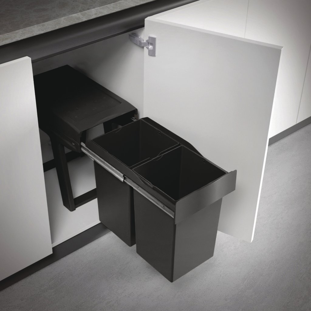 Poubelle Tri sélectif 2 bacs de 14 Litres sortie totale en plastique recyclé coloris Noir.