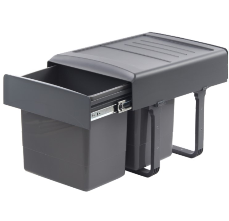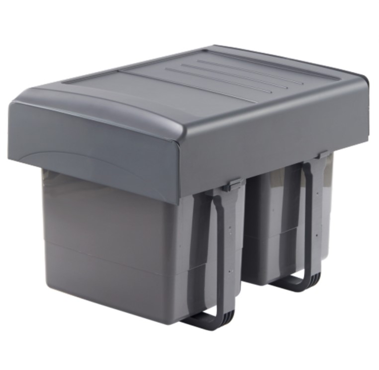 Poubelle Tri selectif avec 2 Bacs de 15 Litres à sortie totale et fermeture douce « soft closing ». Coloris Gris Orion.