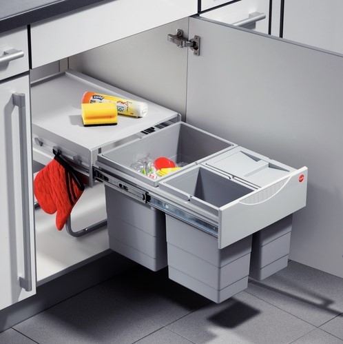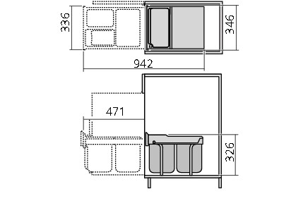 Cette poubelle tri sélectif 3 bacs à ouverture manuelle se compose d’une ossature cadre auto-porté en métal qui se fixe facilement par vis sur le fond du meuble, de 3 seaux de 18 + 8,5 L + 8,5 litres amovible pour le nettoyage et d’un couvercle en plastique rigide gris clair .