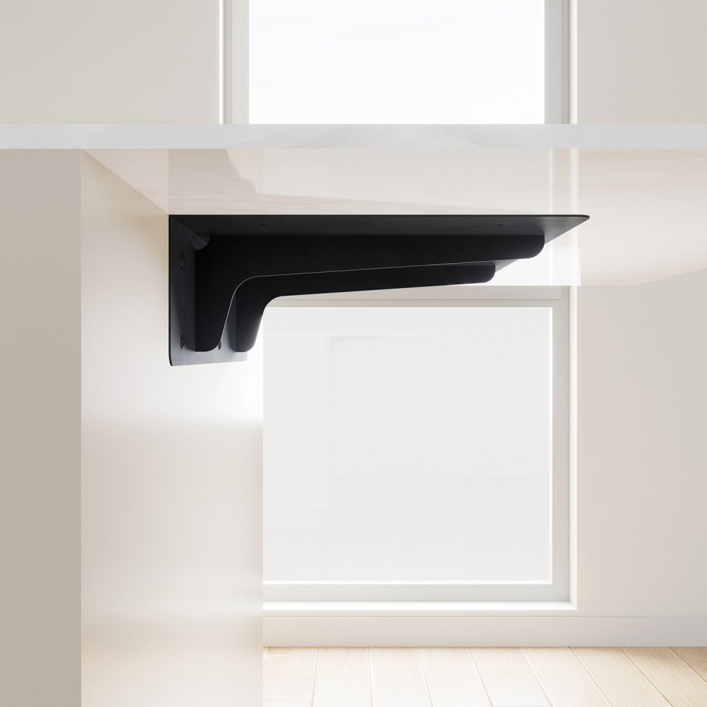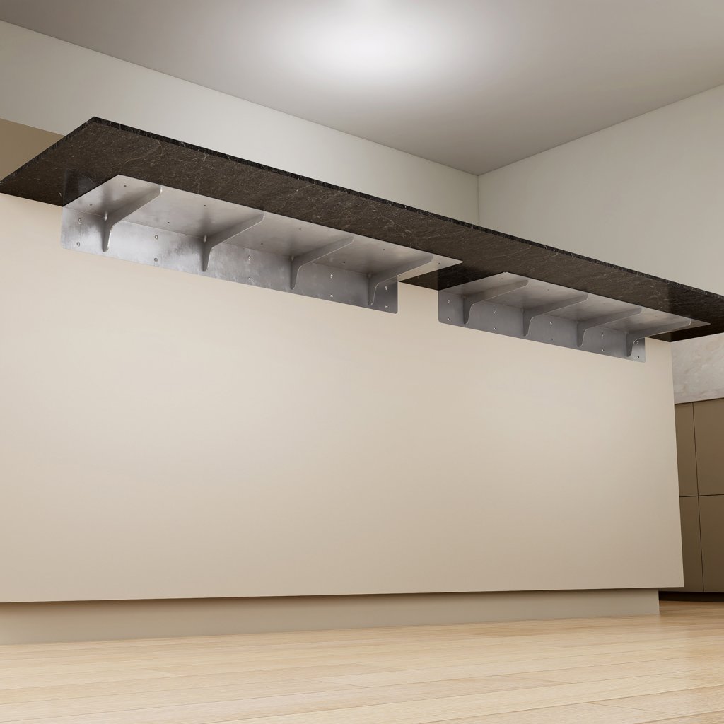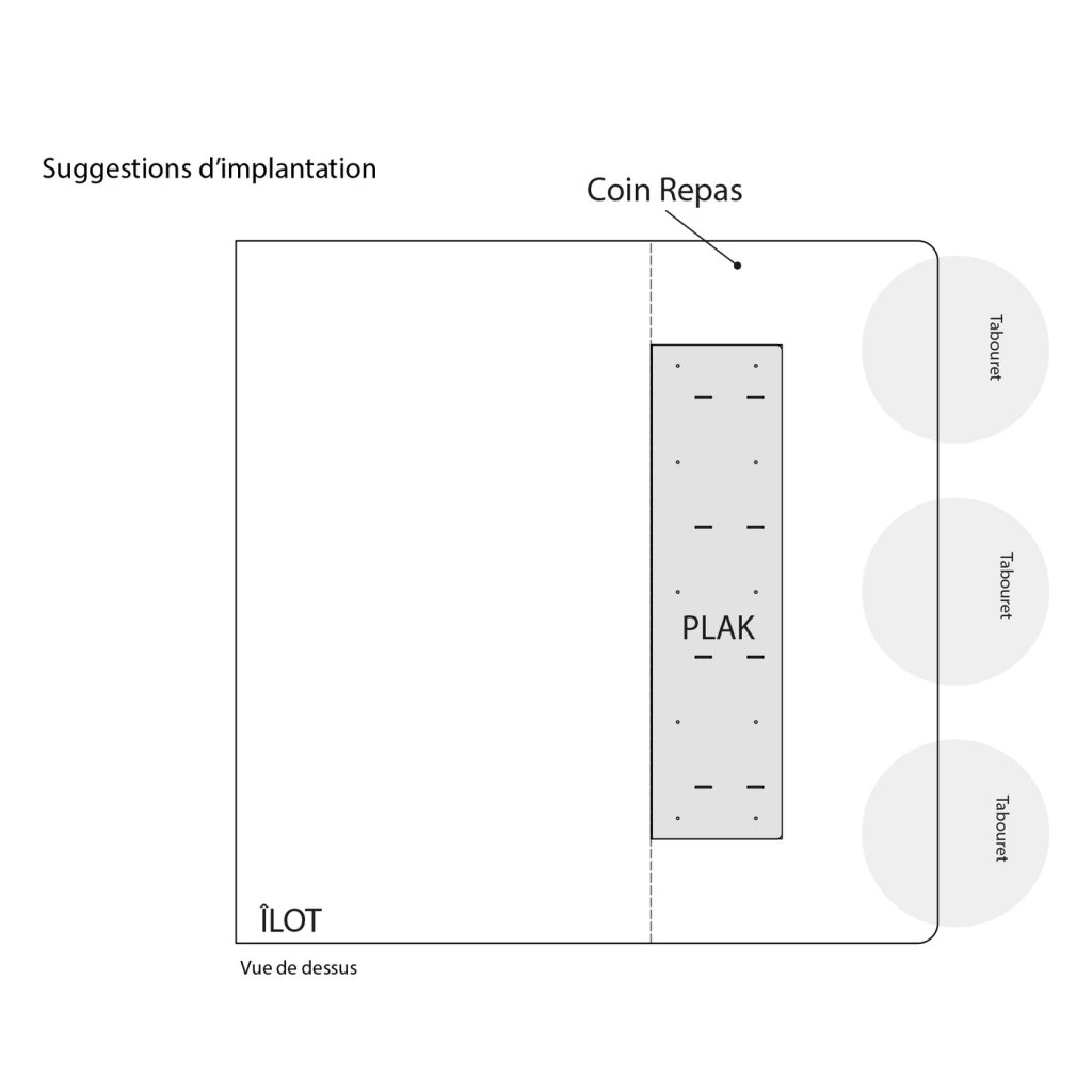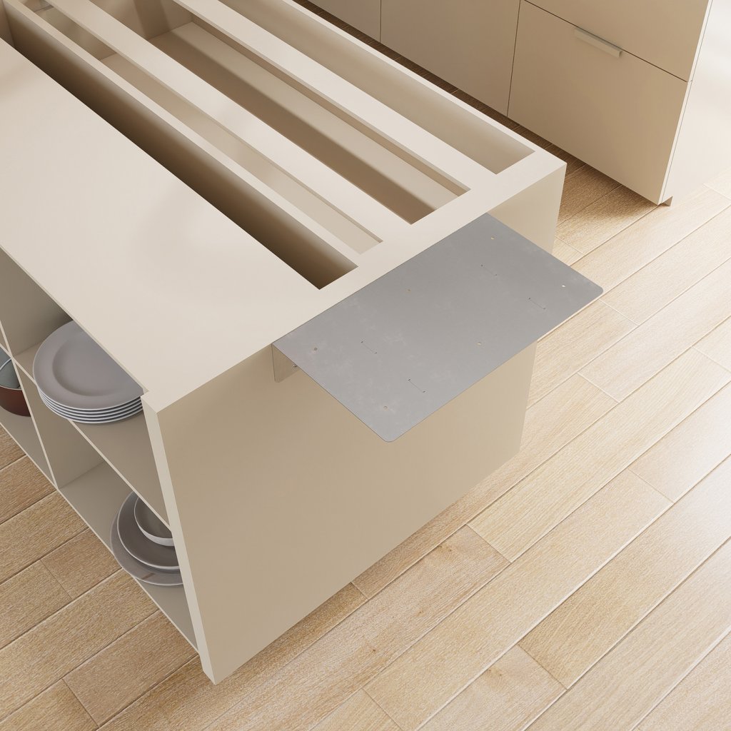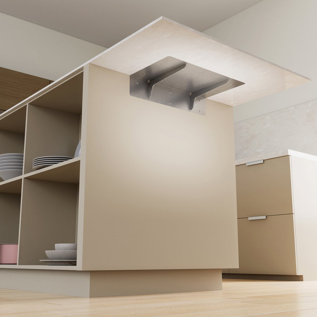 « PLAK » 250 le support spécialement étudié pour fixer des plans de travail ou des coins repas en débord, tout en facilitant le passage des genoux.
