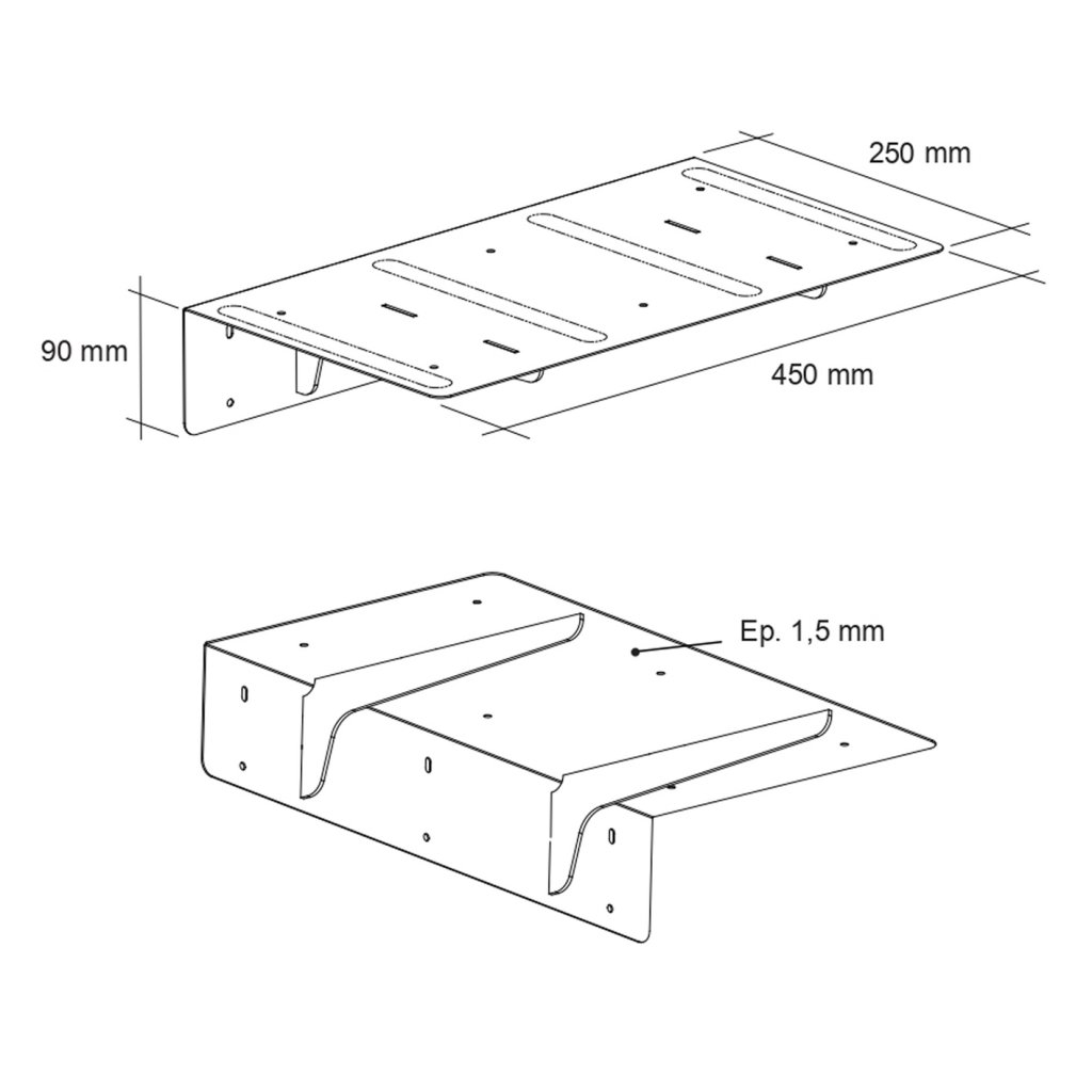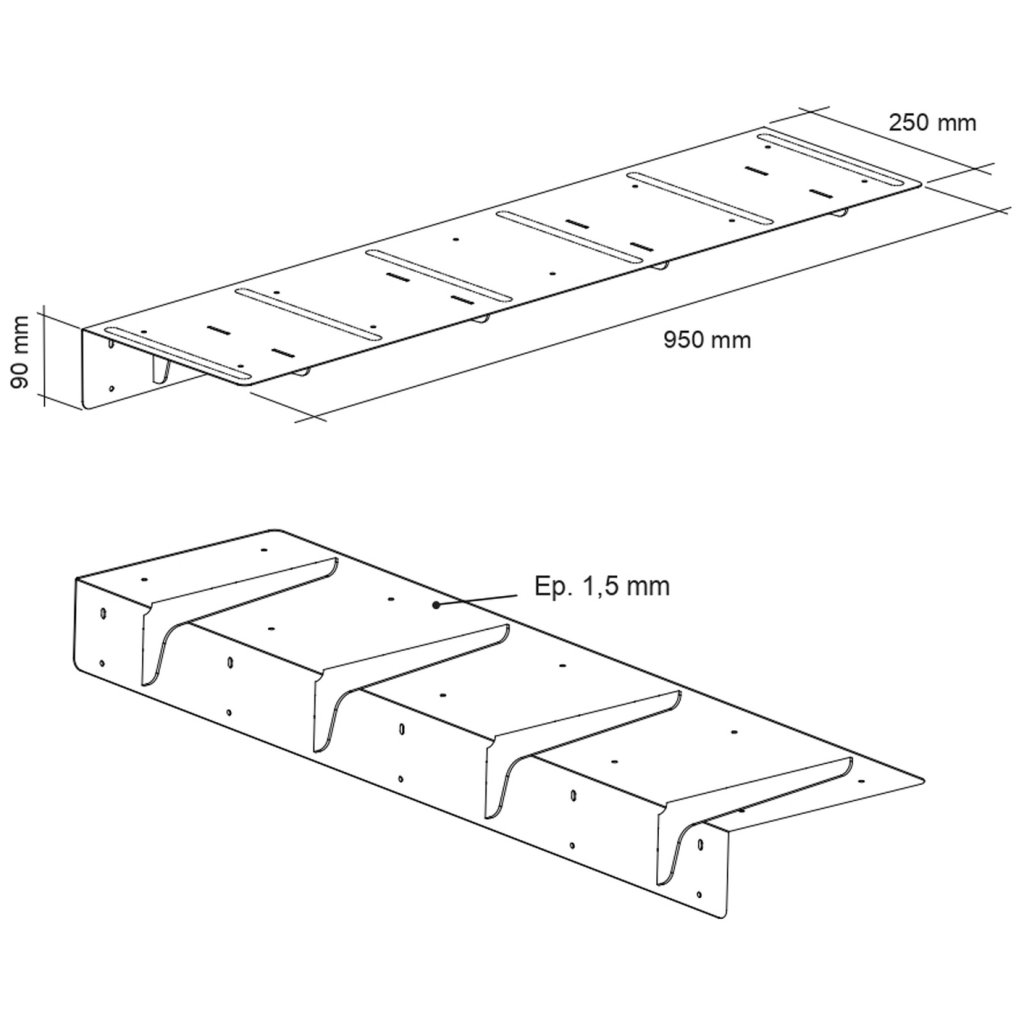 Existe en Inox brossé (AISI304) ou en acier laqué Noir mat (RAL9005) et en deux largeur 450mm et 950mm.