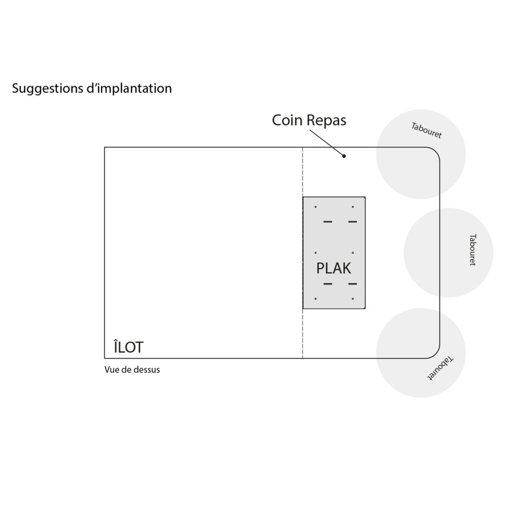 Profondeur 250mm donc débord possible: 250mm supplémentaires par rapport aux préconisations du fabricant de plan de travail (voir préconisation d’implantation dans les photos).
