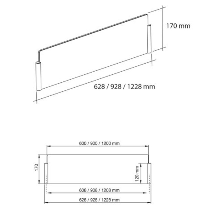 Hauteur de 170mm, épaisseur 8mm. livré avec 2 supports chromés, fixation sous plan (comprise), trous de perçage 6mm.