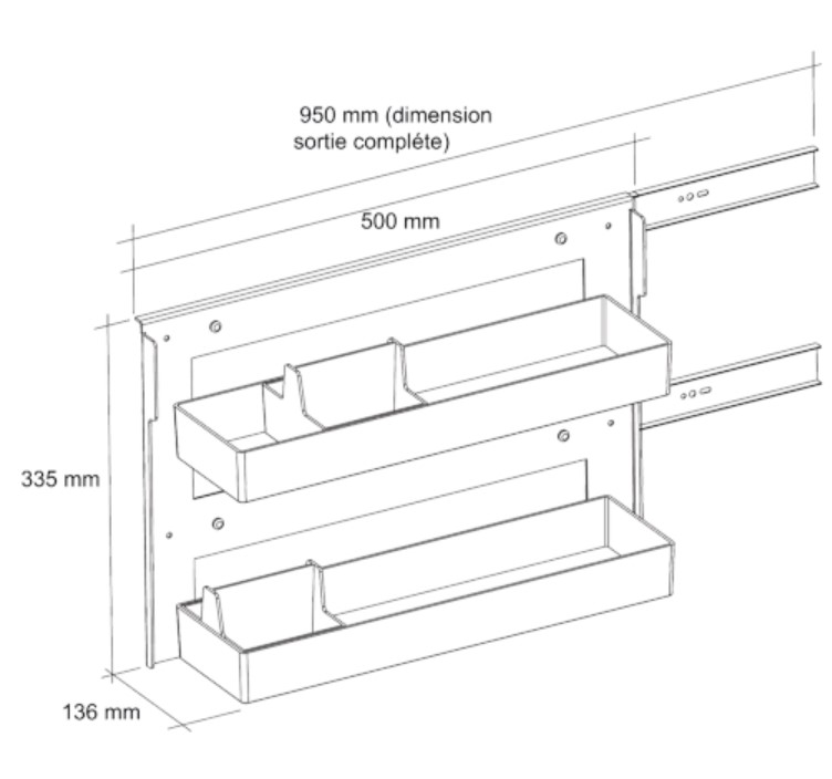 Installation dans le meuble coté opposé des charnières, côté gauche ou droit. Profondeur minimum du meuble 51 cm.